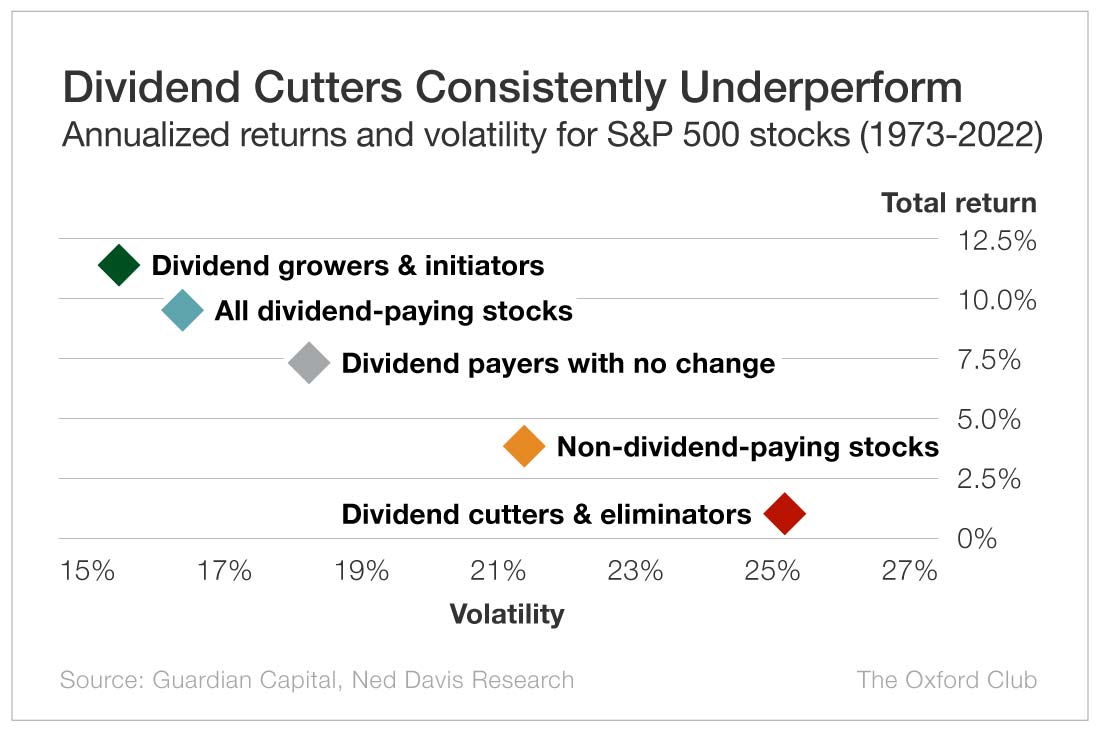 Companies that lower their dividends tend to underperform the S&P 500 by a whopping 15 percentage points over the five years following the cut.