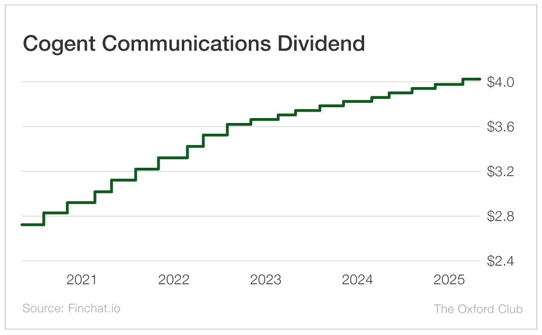 The current quarterly dividend is $1 per share, or $4 annually, which equates to about a 5.6% yield. But Cogent has raised its dividend every quarter for years. In fact, I spoke with CEO Dave Schaeffer. He told me he fully expects to continue quarterly dividend increases.