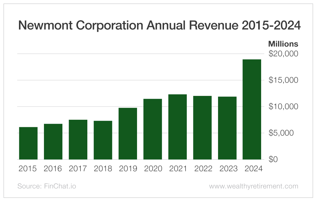 This year, the company expects to produce 5.6 million ounces of gold. Each ounce will cost the company about $1,620 to pull out of the ground and get to the market. With gold currently selling for more than $2,900, each ounce sold represents a profit of about $1,280.