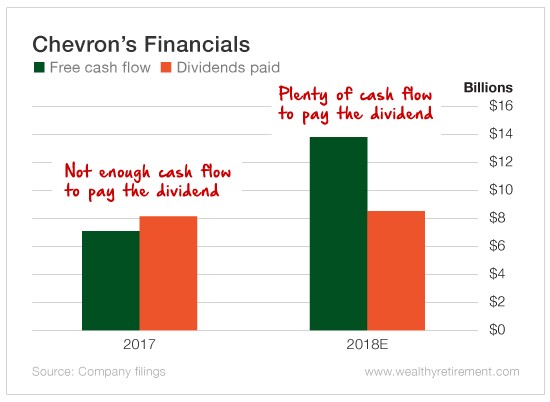 After several years of negative cash flow, Chevron was $7.1 billion in the positive last year. However, it paid out $8.1 billion in dividends. This year, the oil giant is expected to double its free cash flow to $14.1 billion, which would be more than enough to cover the projected $8.6 billion in dividends.