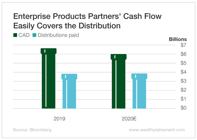 However, even with the projected lower CAD, Enterprise can still easily cover the distribution (MLPs pay distributions, not dividends).