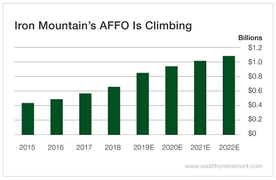 In 2018, Iron Mountain’s AFFO grew 16% to $874 million. In fact, AFFO has been on the rise since 2016, and growth is expected to continue through at least 2022.