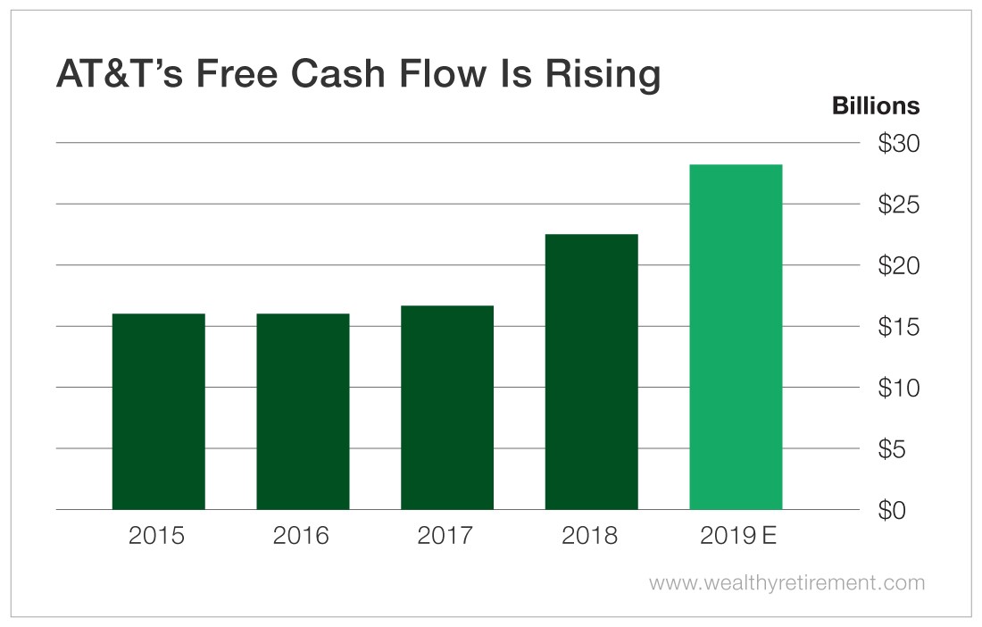 Free cash flow has been rising sharply, and AT&T pays just over half of its free cash flow in dividends. That gives the company the ability to continue to boost its dividend payout every year, as it has since 1985.