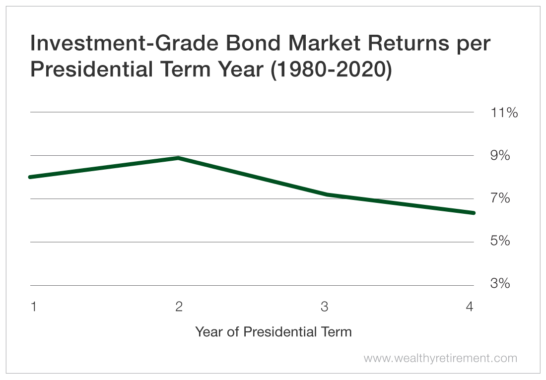 Going back 40 years, the fourth year of a presidential term sees bonds return 6.48% – an underperformance compared with their 8.97% average return during a president’s second year.