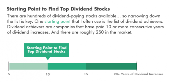 There are hundreds of dividend-paying stocks available… so narrowing down the list is key. One starting point that I often use is the list of dividend achievers. Dividend achievers are companies that have paid 10 or more consecutive years of dividend increases. And there are roughly 250 in the market.