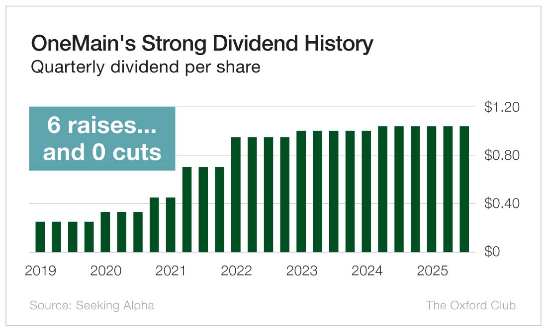 The boost last year was 4%. OneMain has not raised the dividend since the second quarter of 2024, but it has also never cut the dividend. It occasionally pays a special dividend, though it hasn’t done so since 2021.
