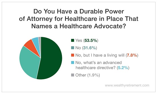 Not too surprisingly, the majority of Wealthy Retirement readers surveyed agree with Steve. More than 53% of respondents already have a healthcare advocate in place, and nearly 8% have a living will.