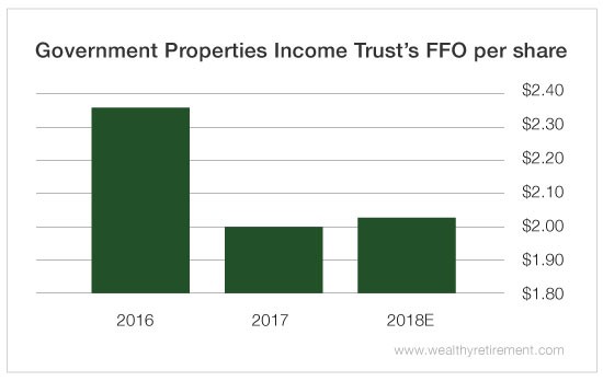 In 2017, Government Properties Income Trust generated $2 per share in funds from operations (FFO), a measure of cash flow used by REITs.