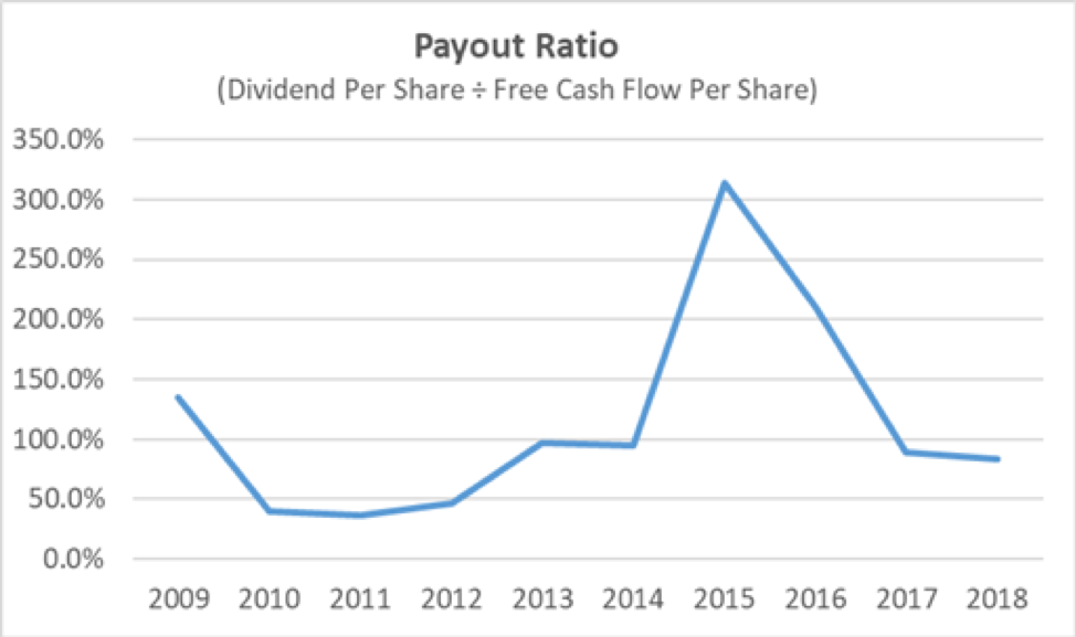 Here’s the Exxon Mobil dividend payout ratio based on free cash flow over the last 10 years…