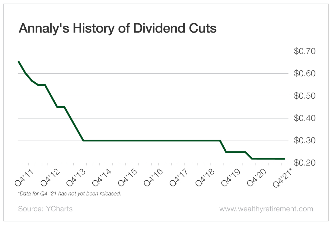 Annaly cut the dividend in 2011, 2012, 2013, 2019 and 2020. In June of last year, the dividend fell 12% from $0.25 per share to $0.22 per share.