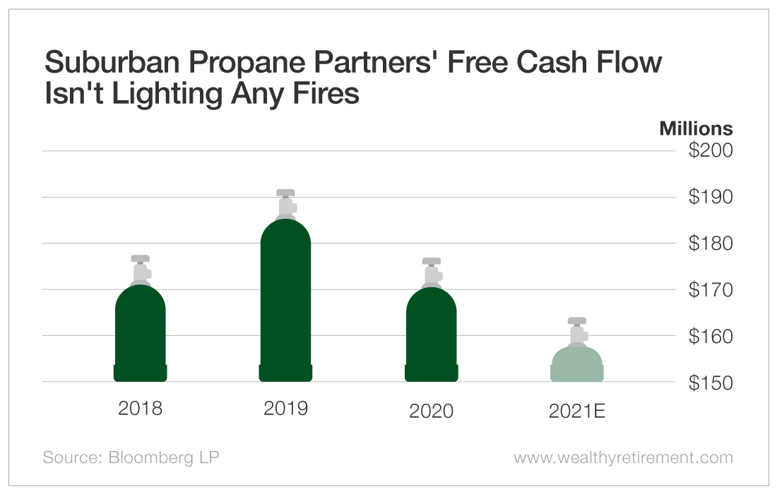 Suburban Propane Partners should be able to easily cover its distribution this year. However, free cash flow is falling, which gets negative marks from SafetyNet Pro.