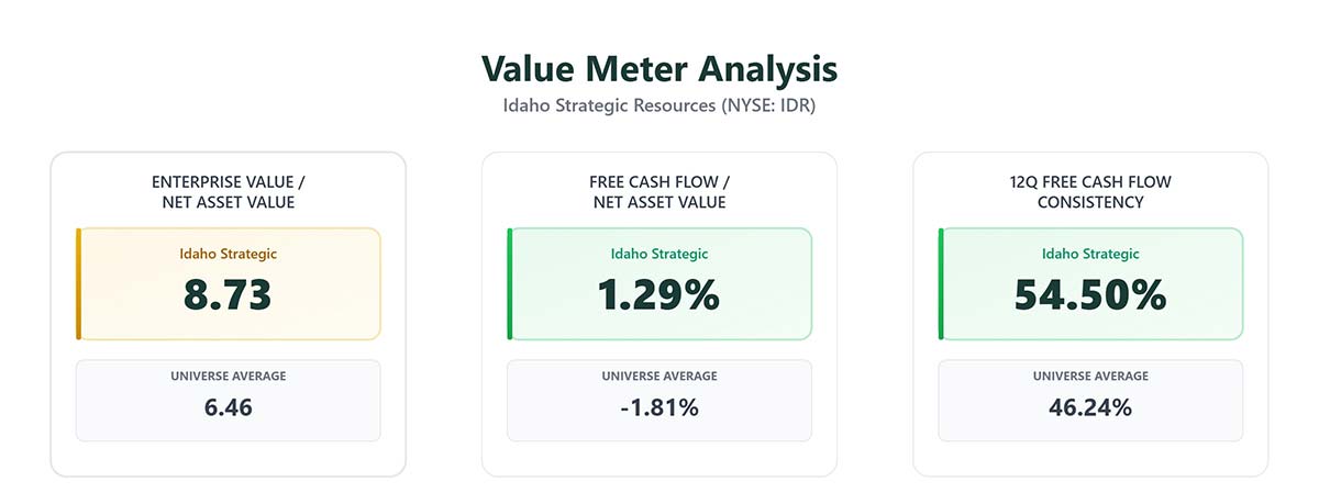 Idaho Strategic’s enterprise value-to-net asset value (EV/NAV) ratio sits at 8.73, above the peer universe average of 6.46. On this measure, the company looks slightly more expensive than its peers.