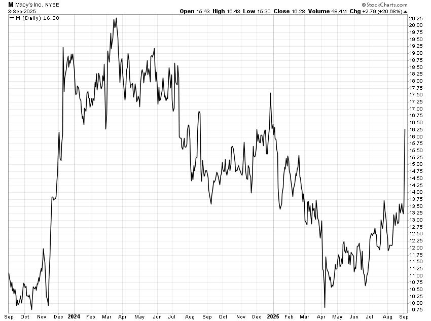After peaking above $20 early in 2024 and at over $17 late in the year, the stock tumbled below $10 in April before staging a modest recovery. Now, after the sharp post-earnings spike, Macy’s trades near $17 – still well off its highs but up more than 40% from its spring lows.