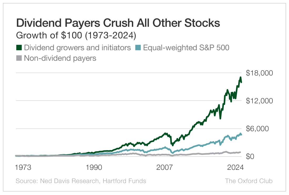 Over the past 50 years, companies that raised or initiated a dividend outperformed the equal-weighted S&P 500 by nearly 3.5 times. They beat non-dividend payers by more than 1,700%.