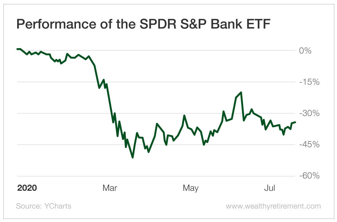 Meanwhile, share prices in the banking sector reflect near-term challenges, not the eventual intermediate-term rebound. The American banking sector, as represented by the SPDR S&P Bank ETF (NYSE: KBE), is still down almost 35% year to date.