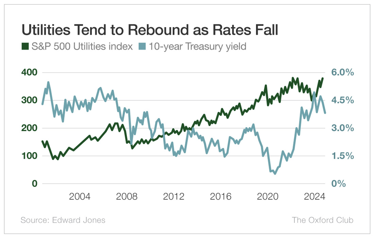 Utilities’ strong dividend yields also become more appealing as rates decline, because low rates make it more difficult to find meaningful yields elsewhere.